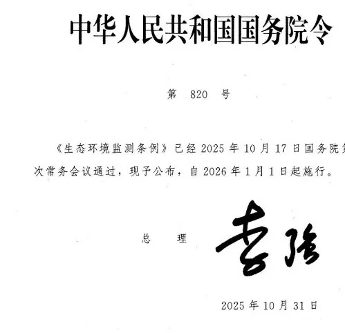 《生态环境监测条例》已经2025年10月17日国务院第70次常务会议通过,现予公布,自2026年1月1日起施行。