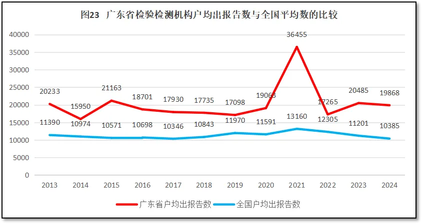 由图23可见,广东省检验检测机构户均出报告数量均高于全国平均水平,说明广东省检验检测机构承接的业务量很大(2021年广东省检验检测机构户均出具报告数量出现一个异常高值,可能存在数据误差)。